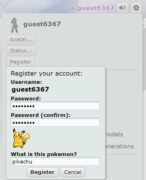 如果你之前沒使用過Pokémon Showdown平台,請註冊一個對戰ID。通過點擊首頁右上角「Choose name」按鈕,會出現一個彈窗,輸入想要的ID名,如果出現要求輸入密碼,則說明此ID已經被人註冊過,我們需要重新選擇其他ID。