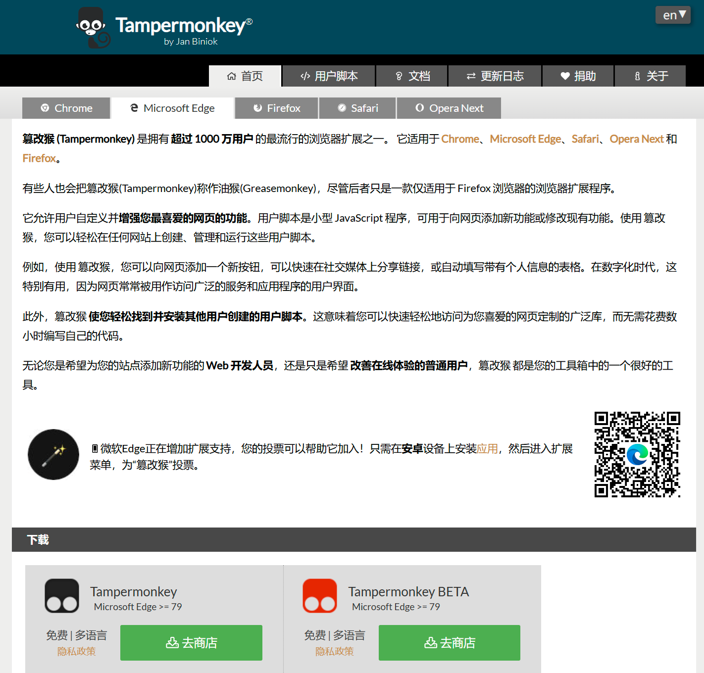 访问 篡改猴 官网,根据不同浏览器,选择对应的下载专区